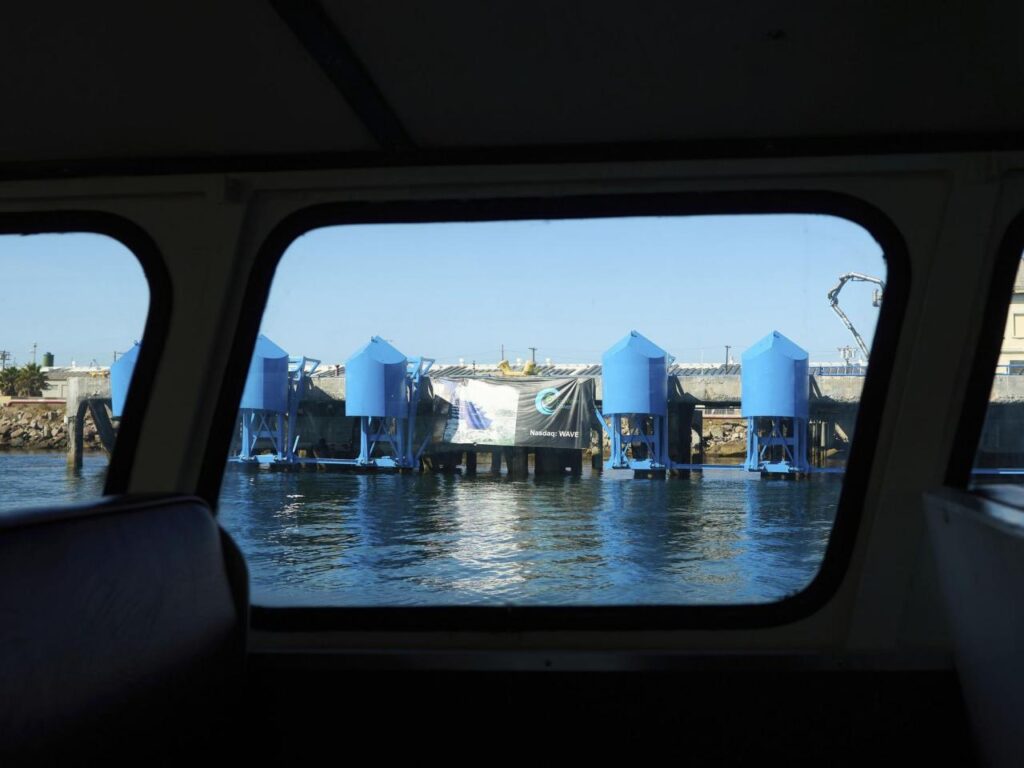 LOS ANGELES (AP) — On a recent sunny morning in a channel at the Port of Los Angeles, seven blue steel structures that look like small boats are lowered into the ocean one by one. Attached to an unused wharf on a site that once housed oil tanks, they gently bob up and down with the waves to generate renewable power. Nearby, a sea lion peeks from the water and pelicans and sea gulls soar overhead.
